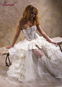Unser Angebot reicht vom schlichten cremefarbenen über das klassisch weiße bis zum glamourösem farbigen Brautkleid. Unsere Kleider werden aus den edelsten Stoffen, wie Seide, Taft und Spitze, gefertigt.